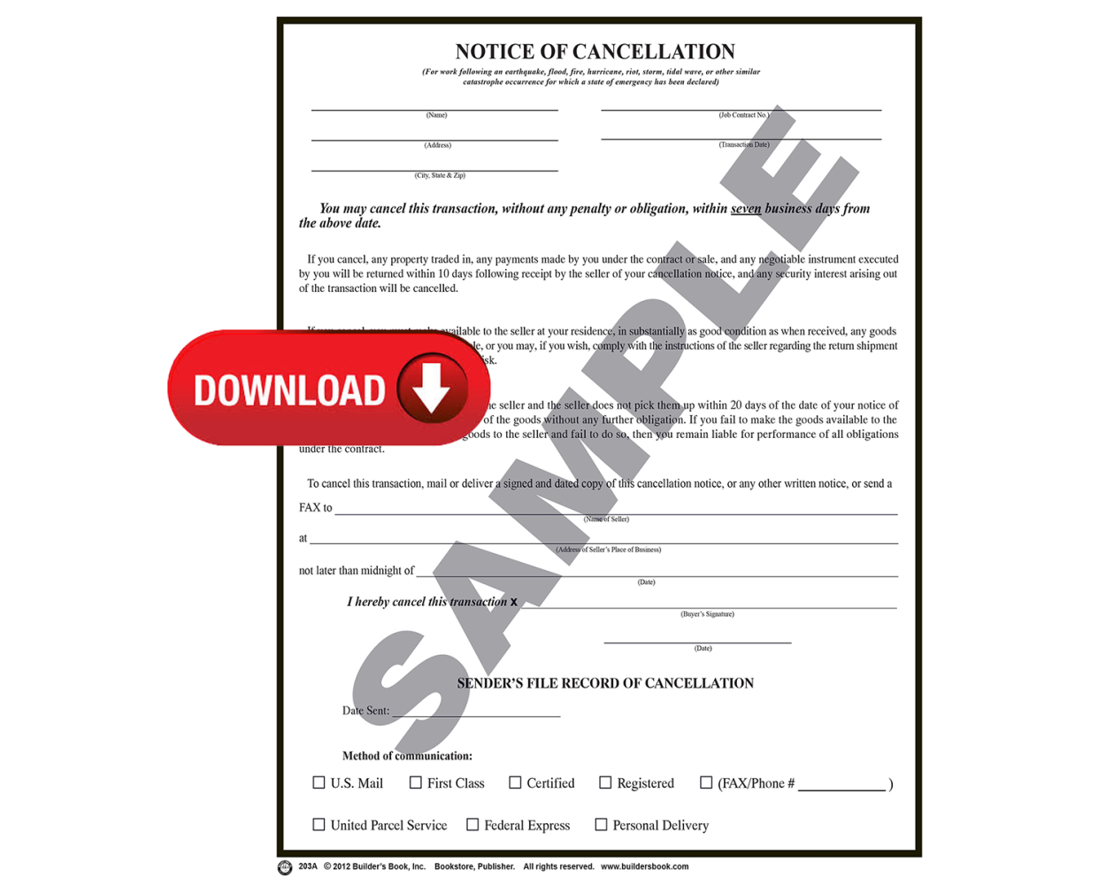 | Description | Form 203A: Notice of Cancellation (7 Days) Instant Download (PDF & RTF) | Builder's Book Notice of Cancellation (7 days) gives the owner the right to cancel a transaction within seven days of the transaction. This notice is required for work following an earthquake, flood, fire, hurricane, riot, storm, tidal wave, or other catastrophic occurrence for which a state of emergency has been declared. What You Get: · Immediate download of the form in two formats: o PDF (requires Adobe Reader) o RTF (requires Microsoft Word) · Formatted specifically for letter-size paper (8 1/2" x 11") Important Details: