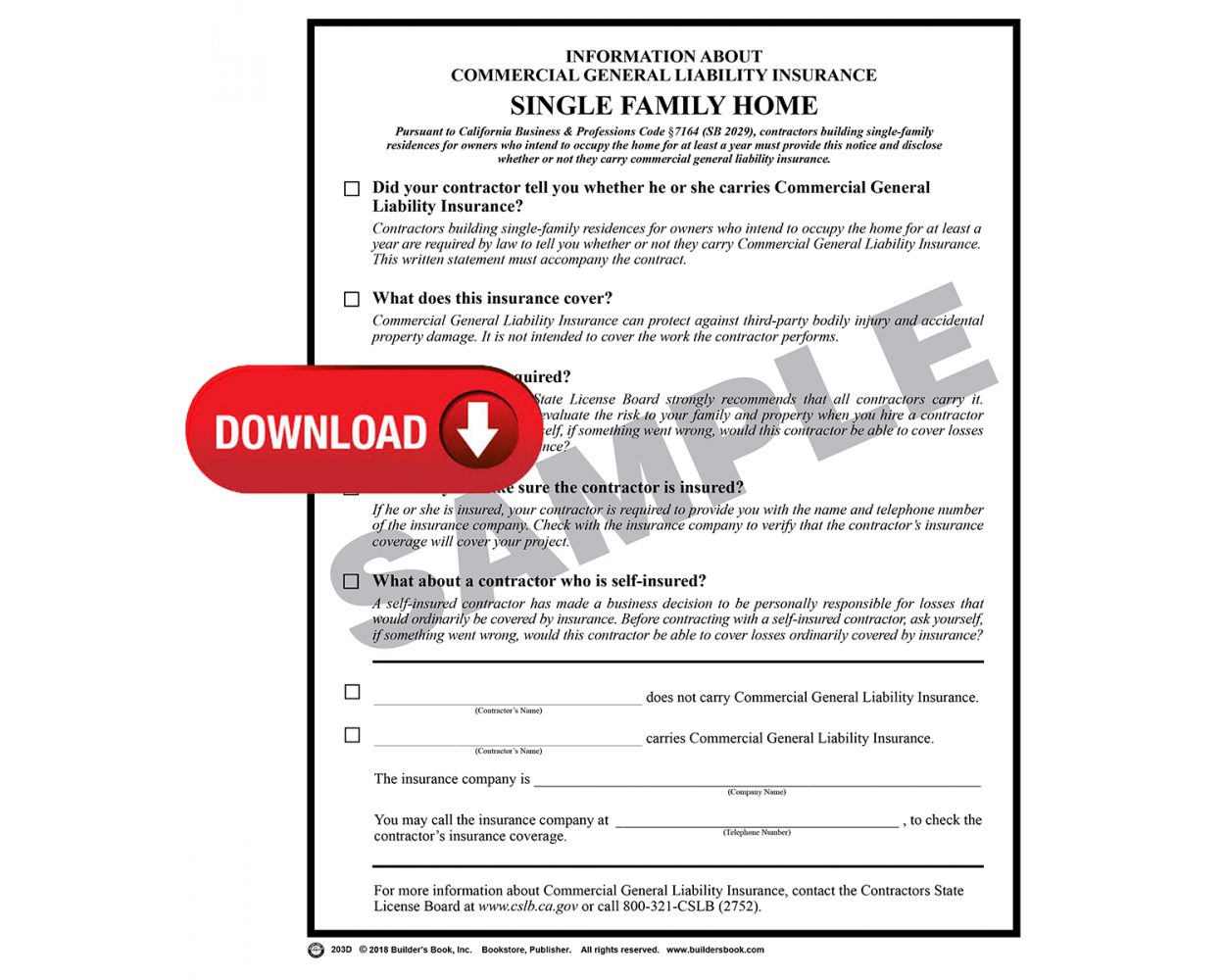 | Description | Form 203D: Information about Commercial General Liability Insurance – Single Family Home Instant Download (PDF & RTF) | Builder's Book You should have the owner sign or initial this copy so that you also have a record that you have delivered these notices to the customer. The Information about Commercial General Liability Insurance – Single Family Home, is a document that contains information about Commercial General Liability Insurance. This document covers frequently asked questions regarding the contractor’s insurance coverage. The Business and Professions code requires contractors building single-family residences for owners who intend to occupy the home for at least a year, must provide this checklist notice and disclose whether or not they carry Commercial General Liability Insurance. Contents of the Information about Commercial General Liability Insurance Single Family Home