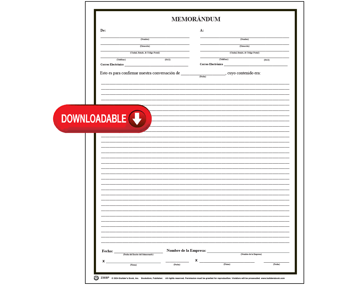 | Description | 236SP- Memorándum (Descarga de PDF) Los formularios descargables son de venta final y no reembolsables. EL ENLACE DE DESCARGA SE ENVÍA EN EL CORREO ELECTRÓNICO DE CONFIRMACIÓN UNA VEZ COMPLETA LA TRANSACCIÓN. Se deben imprimir copias separadas para cada destinatario ¡Ponlo por escrito, ponlo por escrito, ponlo por escrito! No importa con qué frecuencia escuchemos ese consejo, es muy fácil olvidarlo. Con las mejores intenciones, todos posponemos fácilmente escribirlo. Con la misma frecuencia vivimos para arrepentirnos. Este es un formulario simple, fácil de usar y muy práctico. Úselo. |