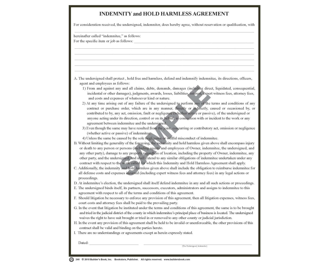 Indemnity and Hold Harmless Agreement Click here to review a sample of this form. This is a contract where the undersigned shall protect, hold free, defend, and indemnify indemnitee, its directors officers, agent and employees. From and against any all claims, debts, demands, damages, judgments, awards, losses, liabilities, interest, expert witness fees, attorney's fees, and cost of any other nature. Authorized signature line included. ISBN/Book No.: 246 |