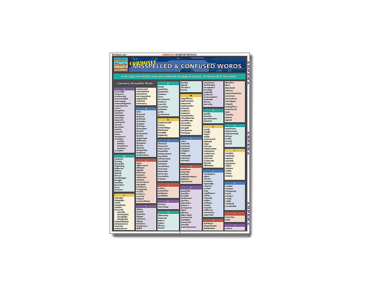A collection of the most popular misspelled, confused and misused words. 6-page laminated guide includes: listing of commonly misspelled words listing of frequently misused/confused words