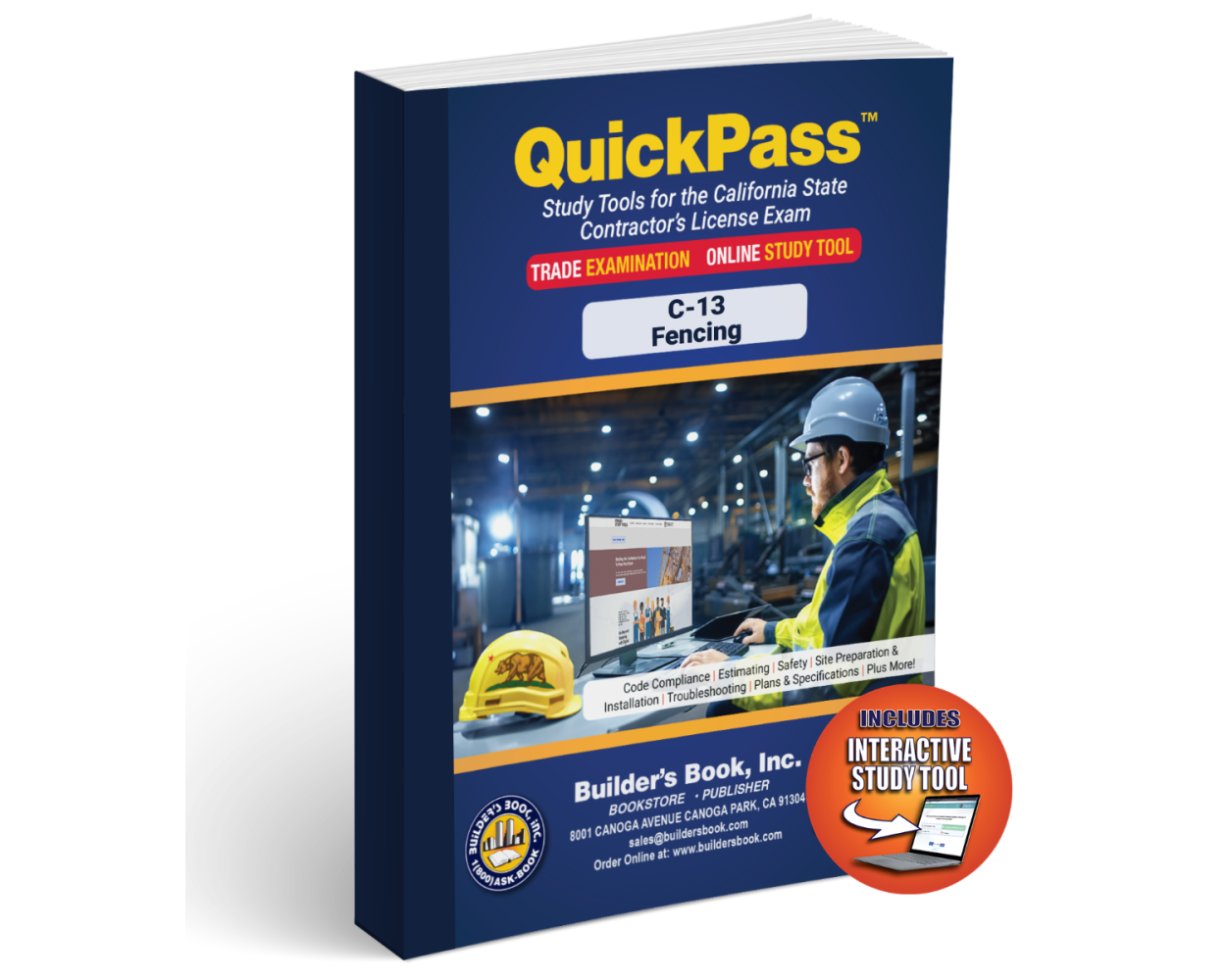 | Description | NEW QUESTIONS FOR 2026! Fencing License Examination (C-13) - QuickPass Study Tool with Interactive Program by Builder's Book, Inc. Software is Final Sale and Non-Refundable. NOW INCLUDES A FREE COPY OF OUR NEWLY PUBLISHED BUILDER'S GUIDE TO CONSTRUCTION MATHEMATICS!