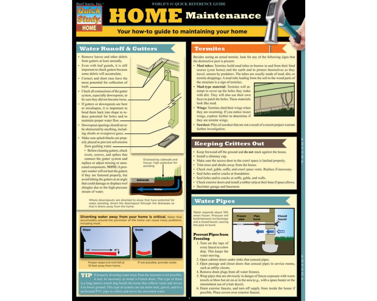 Keep your home maintained and safe with BarCharts new Home Maintenance guide. This three-panel guide, complete with handy illustrations, diagrams, and charts, features tips and techniques for maintaining your home inside and out. Termite and pest control, leaks, toilet maintenance, and smoke detectors are just some of the topics covered in this handy reference. This guide is a great gift for new homeowners and a valuable resource for anyone wanting to keep their home in tip-top shape and prevent costly repairs.