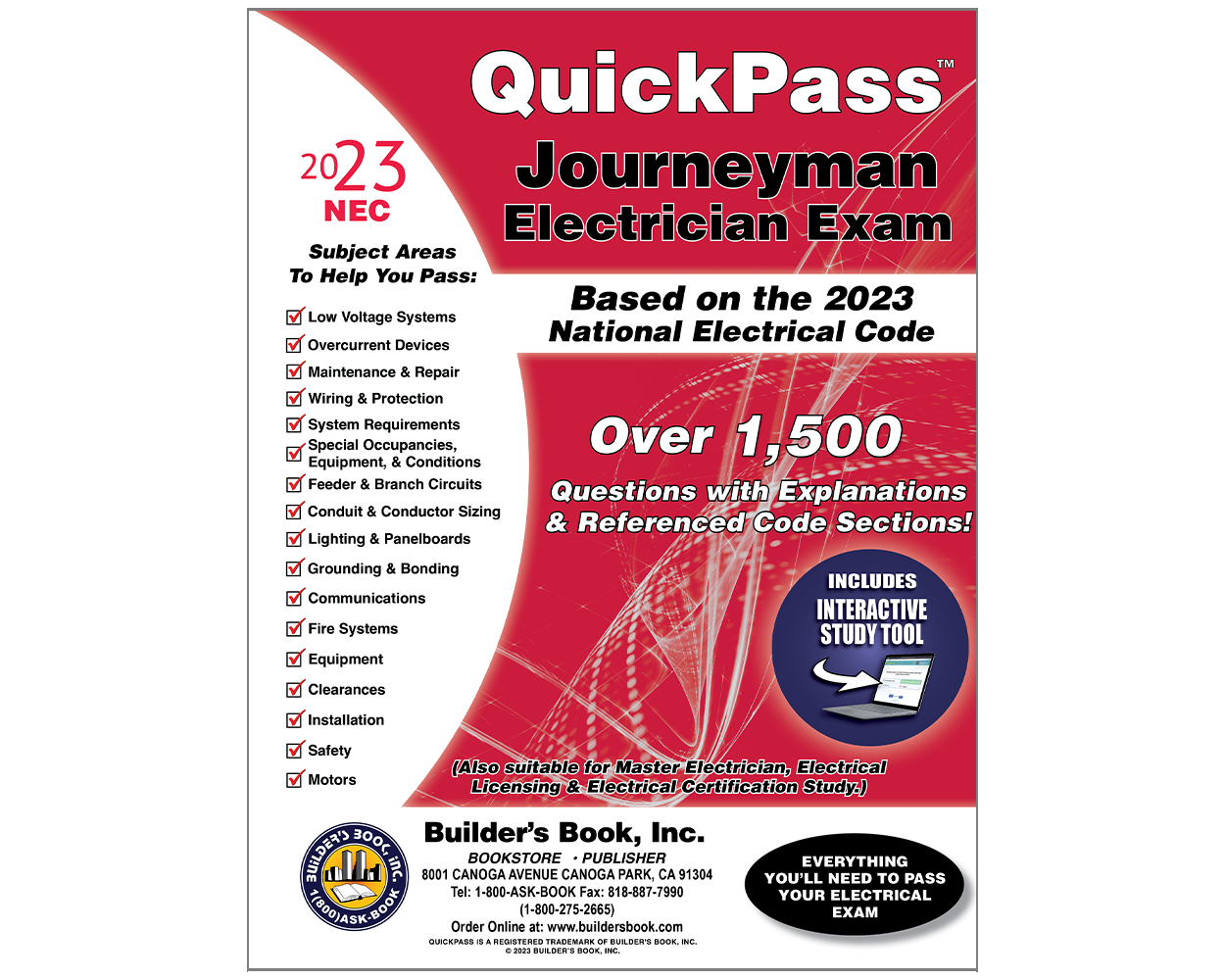 | Description | Journeyman Electrician QuickPass Study Tool Book Based On The 2023 NEC with Online Interactive Software This publication contains over fifteen hundred multiple choice questions, formatted similarly to the exam, based on the National Electrical Code 2023. Review the NEC citied sections in the explanations to make sure you understand the questions and answers. Studying this information will help you pass any electrical exam whether you are a beginner or experienced electrician! Now Includes Access Key to Online Interactive Study Tool, which was developed to operate in the same computerized, multiple-choice question manner as the exam. Questions available in both Study Mode & Exam Mode (timed or untimed). •Use it anytime and anywhere! •Unlimited Access! Subject Areas To Help You Pass: