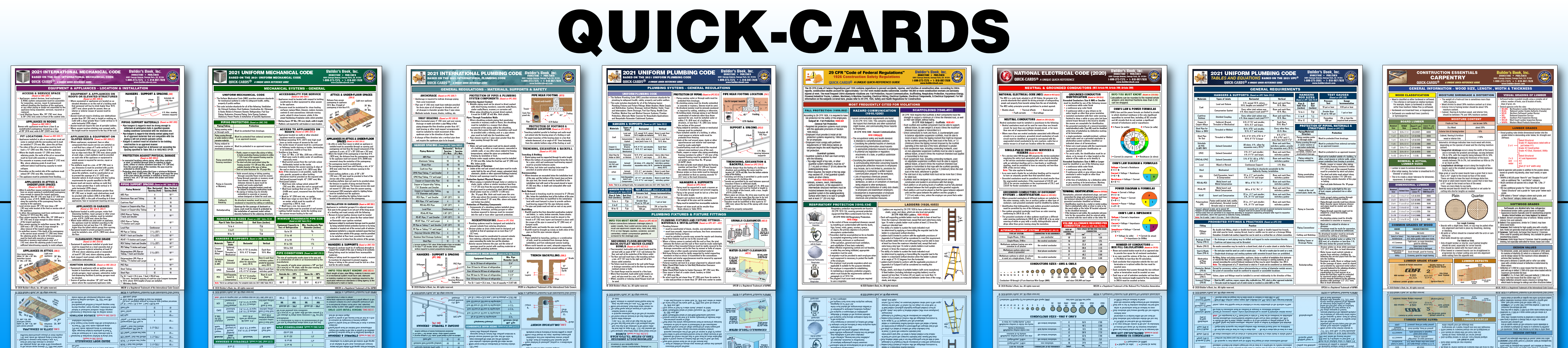 Quick-Cards are handy, full-color, plastic-laminated references to the most popular topics in construction. Most are 4-pages, but a few are expanded, 6-page guides. Regardless of the number of pages, most are just $7.95 each. And like everything else in the Builder's Book store, they're 10% off, every day!