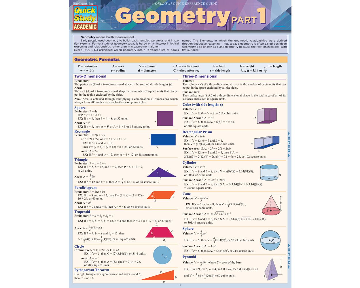 | Description | QUICK STUDY: GEOMETRY PART 1 Understanding the basics of geometry is fundamental for many higher levels of mathematics. Our updated geometry study guide is a great way to review and reinforce the key concepts of this tricky math application. For complete coverage and to really boost grades and test scores, get the Geometry Part 2 QuickStudy guide and combine them to study, reference, and review. |